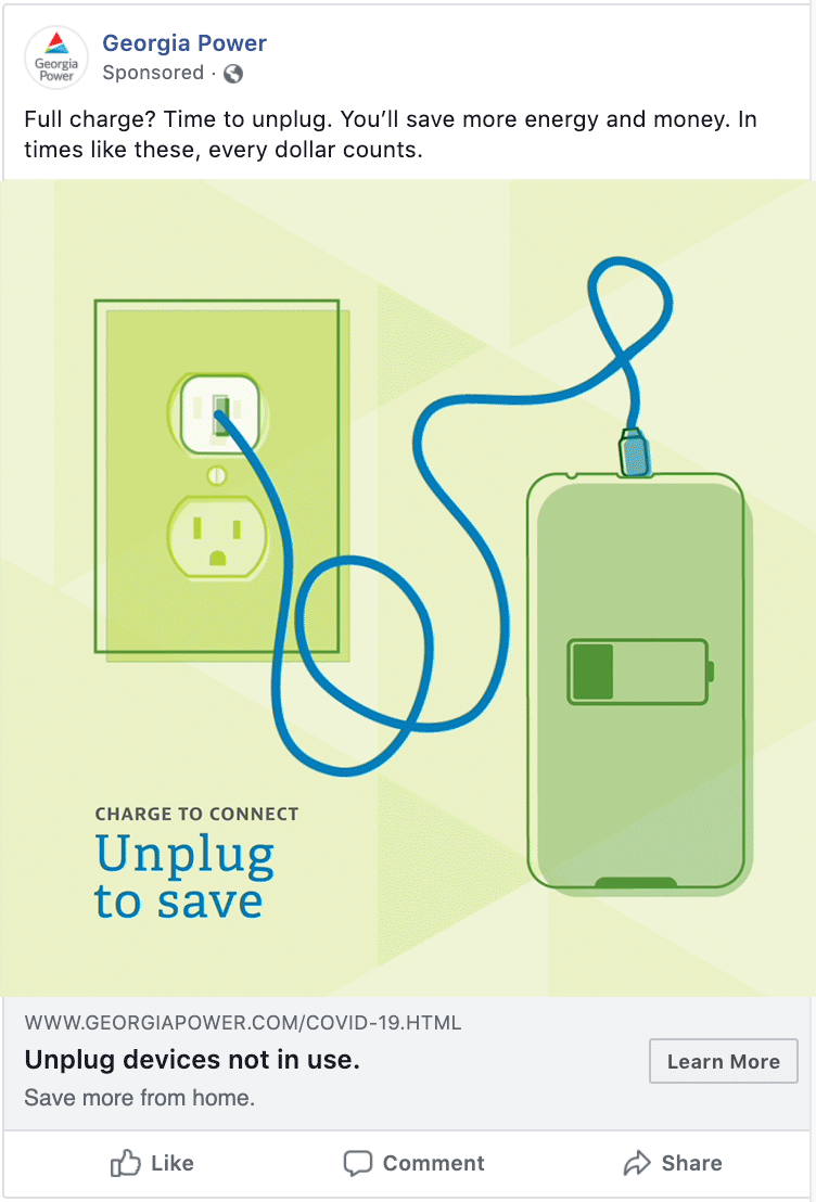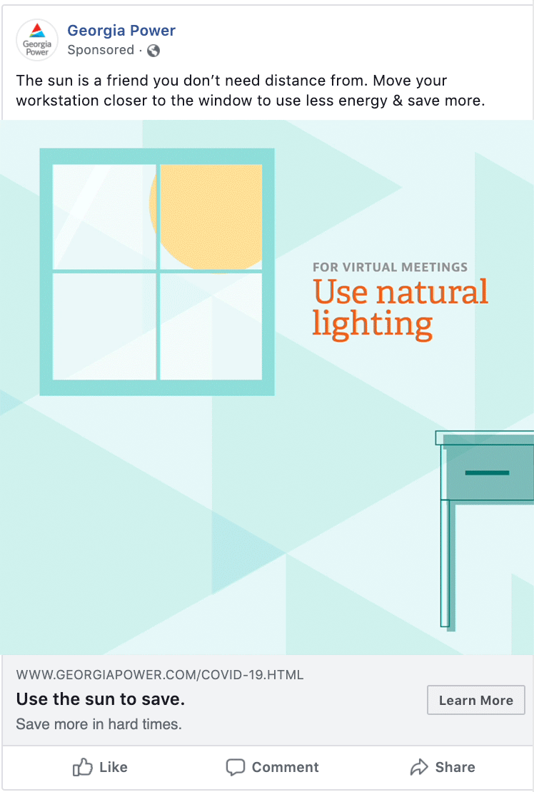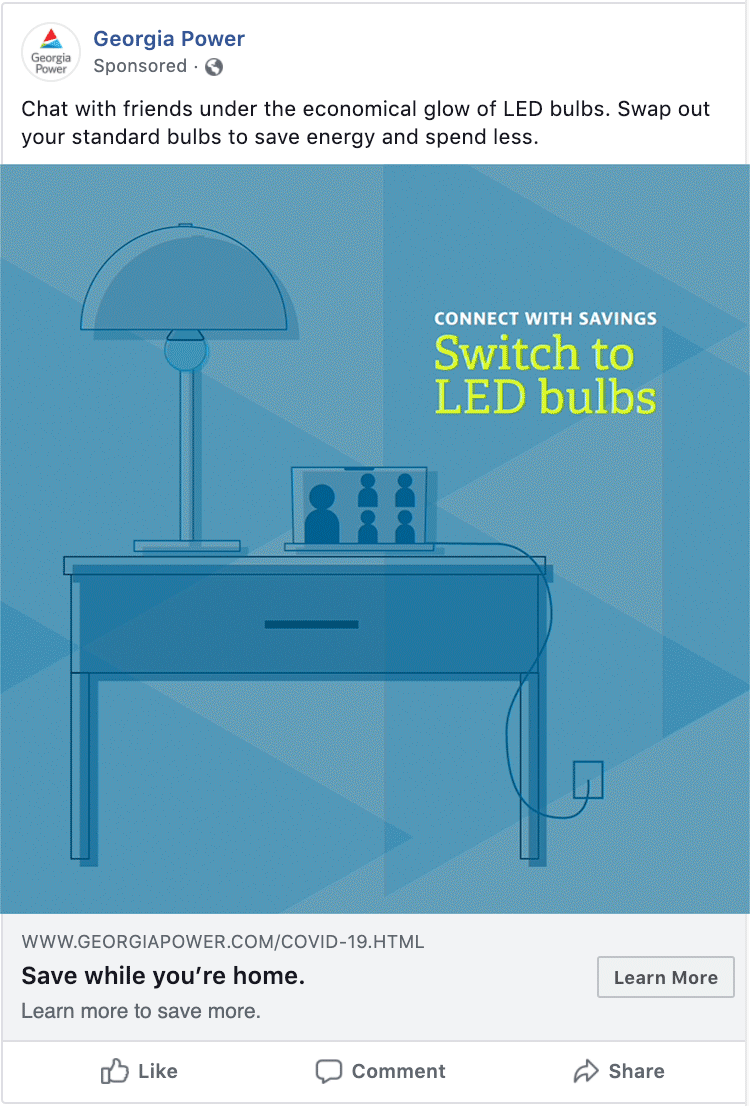 We wanted to approach social messaging during the Covid-19 pandemic in a practical way, giving the people of Georgia tips to save money on their power bills through better energy efficiency at home. The messaging needed to deliver an energy efficiency tip while nodding to stay-at-home orders and the financial instability of the nation.